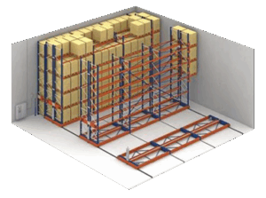 ระบบชั้นวางสินค้าแบบเคลื่อนย้ายได้นี้มีชั้นวางแบบคงที่ 2 ชั้นที่ปลายแต่ละด้าน โดยมีชั้นวางแบบเคลื่อนย้ายได้บนรถเข็นวางอยู่ตรงกลาง ซึ่งแตกต่างจากชั้นวางแบบคงที่ทั่วไปที่ต้องมีทางเดินทุกๆ 2 แถว ระบบนี้ต้องการทางเดินเพียงทางเดียวต่อการติดตั้ง เนื่องจากรถเข็นจะเลื่อนเพื่อสร้างทางเดินเมื่อจำเป็น การออกแบบนี้ช่วยลดพื้นที่จัดเก็บได้ 50%